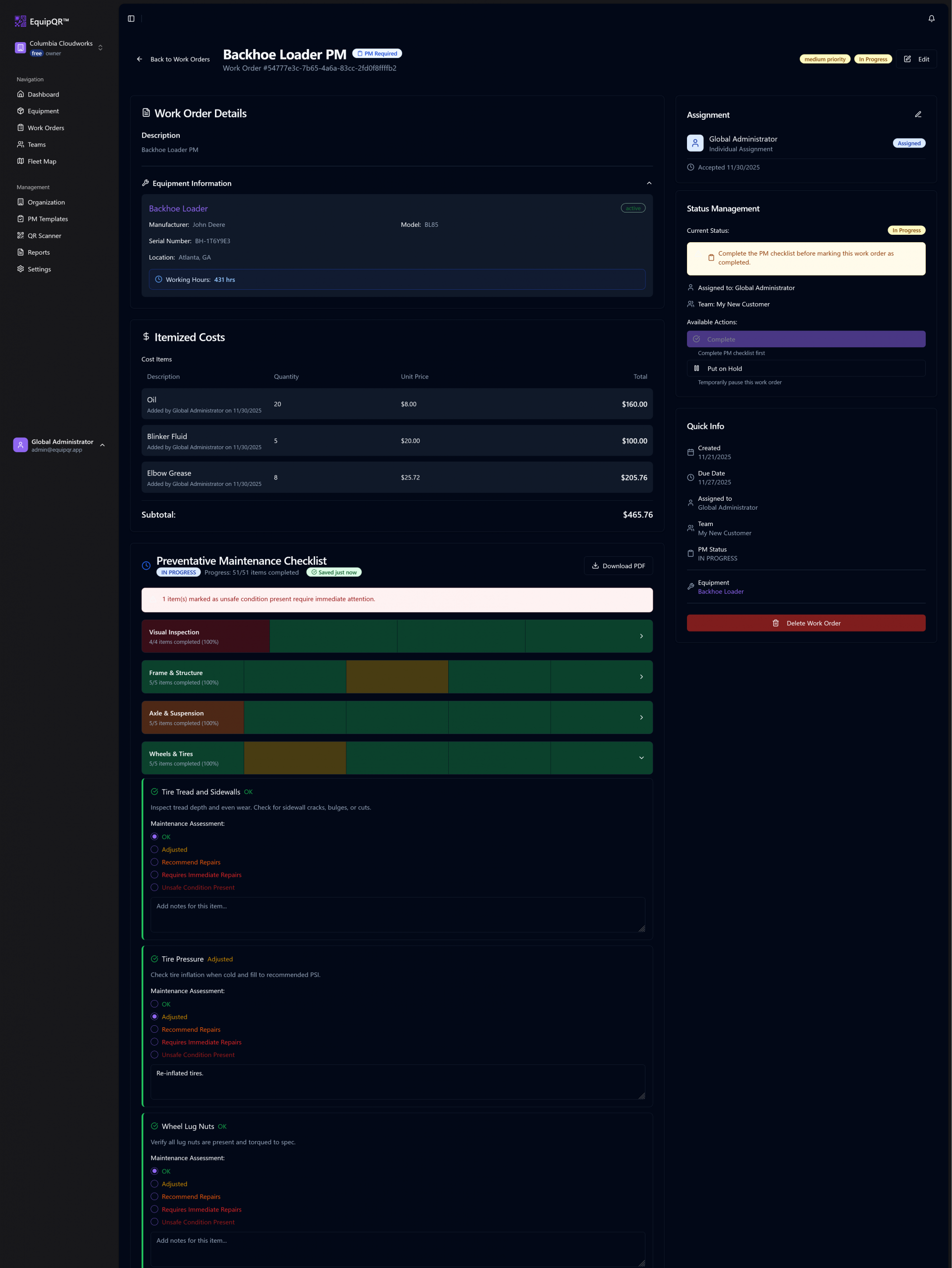 Color-coded statuses for each PM checklist section allows you to see the state of the equipment at a glance.