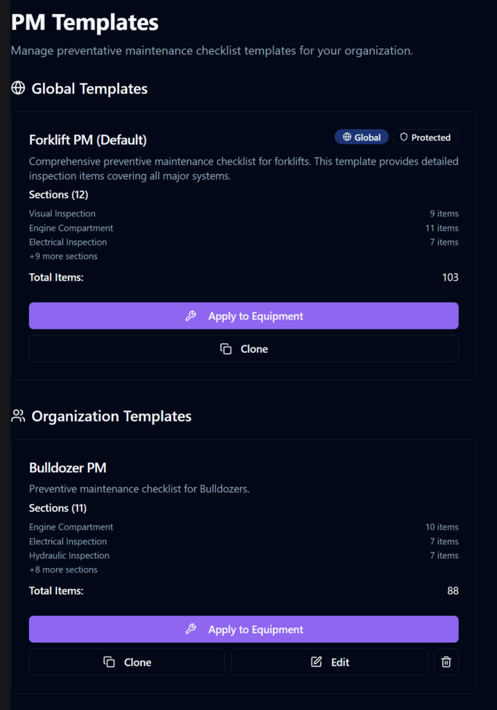 For subscribed organizations (with at least one paid user license), these checklists become fully customizable. You can clone, edit, and extend any global template — or build your own from scratch — to match your exact equipment lineup and service process.