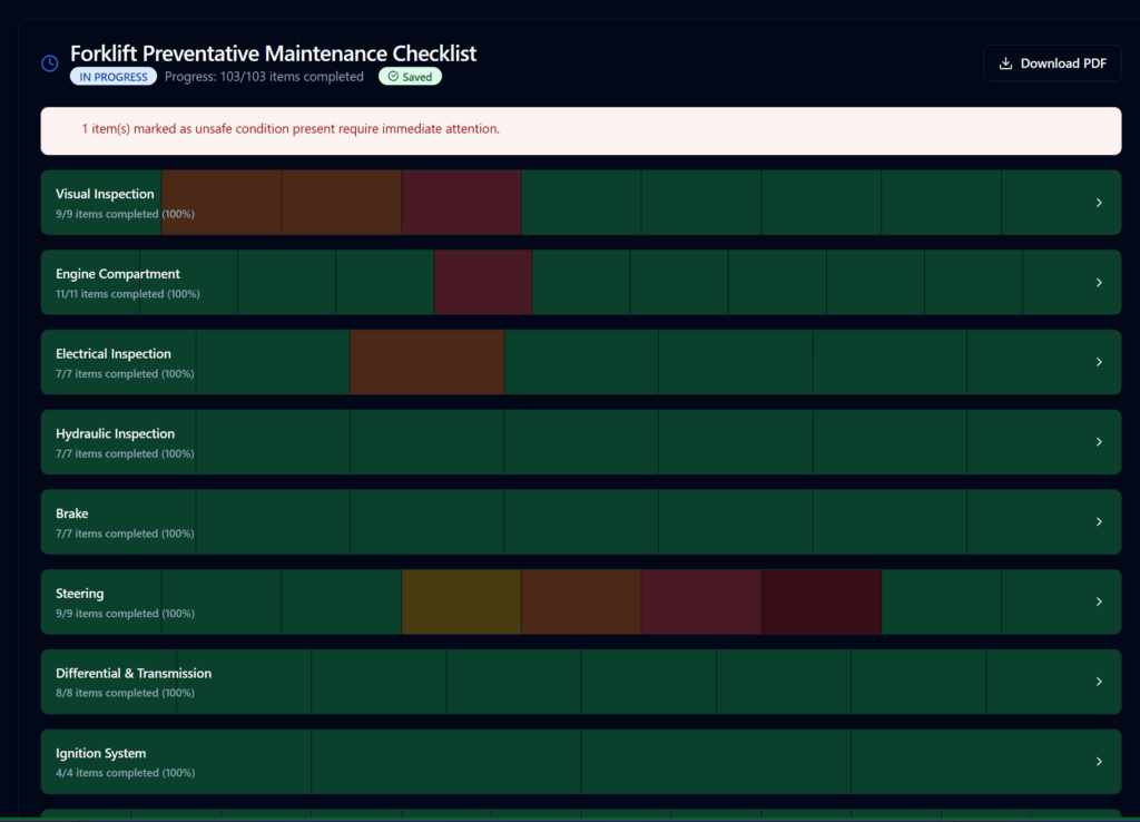 Our checklists are thorough, field tested, and tell you a complex story about the state of the equipment at a glance. A well trained mechanic will be able to see the color-coded checklist and deduce the problem as they notice patterns in the work over time.