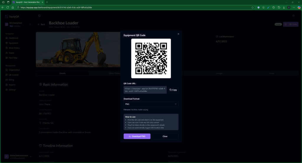 We designed EquipQR, a SaaS web app that turns every asset into a scannable digital record.